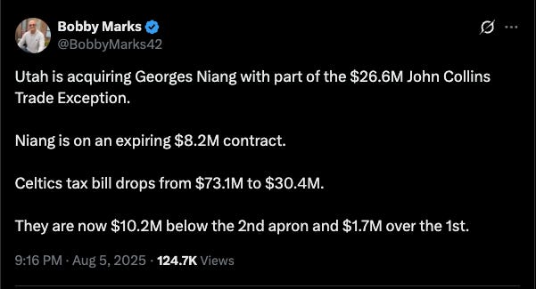 Celtics received: Georges Niang, a 2031 second-round pick and cash via the Nets