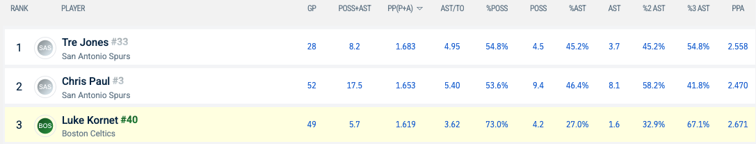 In fact, Synergy has Kornet ranked SEVENTH in the NBA for possessions + assists. When you set a minimum of 100 possessions to filter out low-usage players, Kornet jumps to third behind Tre Jones and Chris Paul.