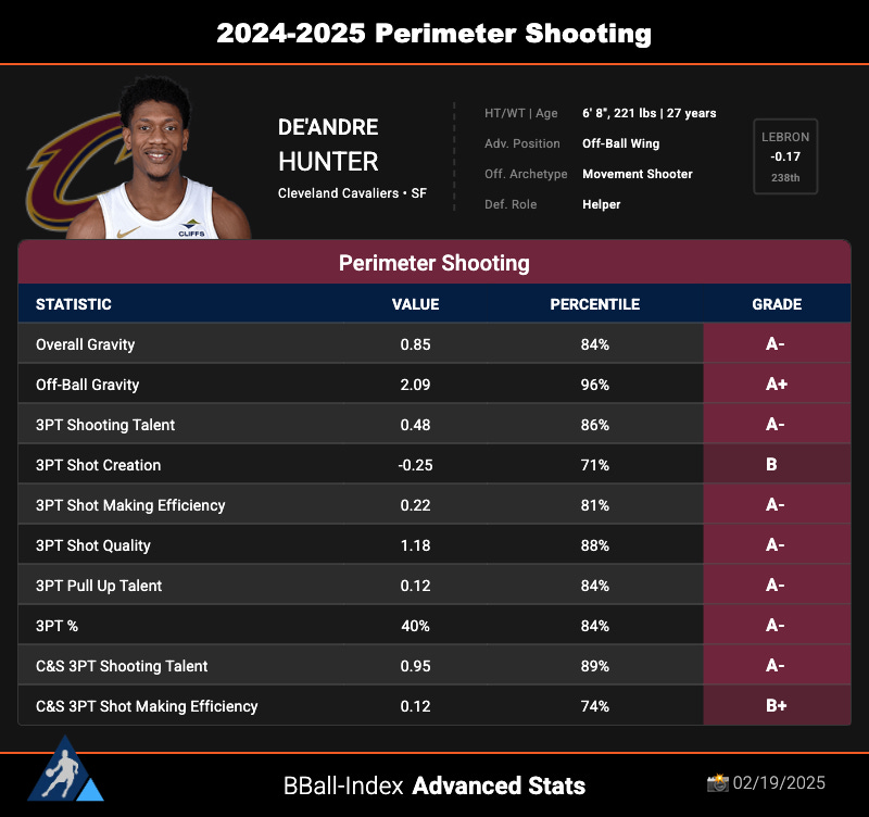 When answering this question, I did get curious regarding Hunter’s overall value as a three-point threat. I think the below chart from The Basketball Index paints a perfect picture and shows how Hunter’s floor spacing can be a serious weapon for a Cavaliers team that has Donovan Mitchell, Darius Garland and Allen all capable of slicing through a stretched defense.