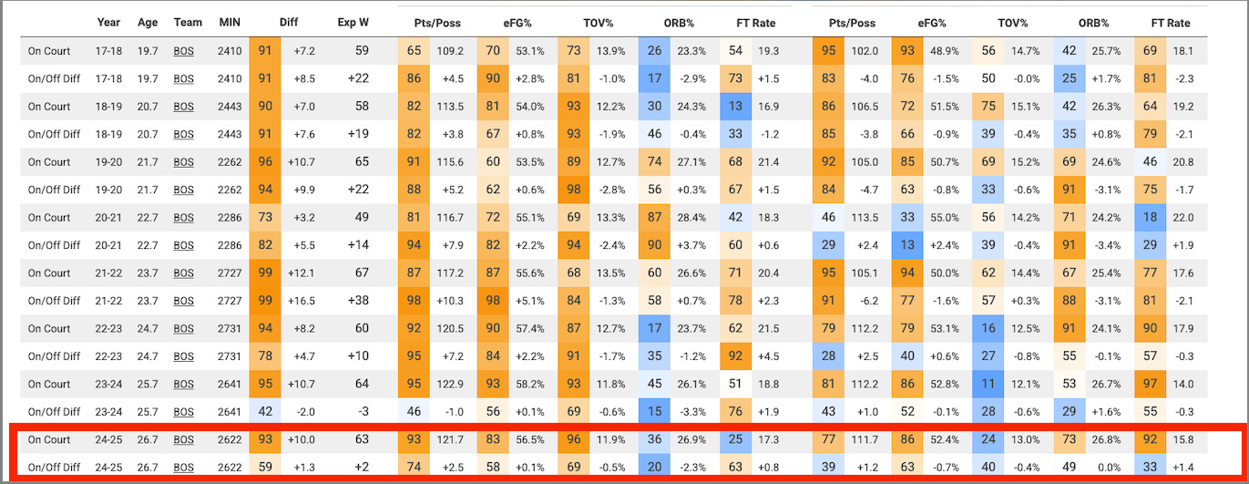 According to Cleaning The Glass, the Celtics outscored teams by an additional 8.7 points per 100 possessions when Tatum was on the floor, thus proving his insane value — or at least, that’s how I read the chart below…I could be wrong there.