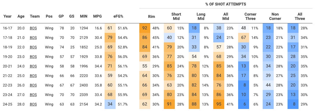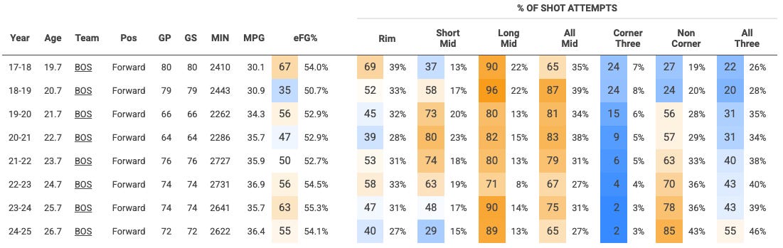 Tatum took a slightly different approach this season, prioritizing the perimeter more than usual. 46% of his total offense came from behind the three-point line, which was a career-high for him, with only 3% of those shots coming from the corner.