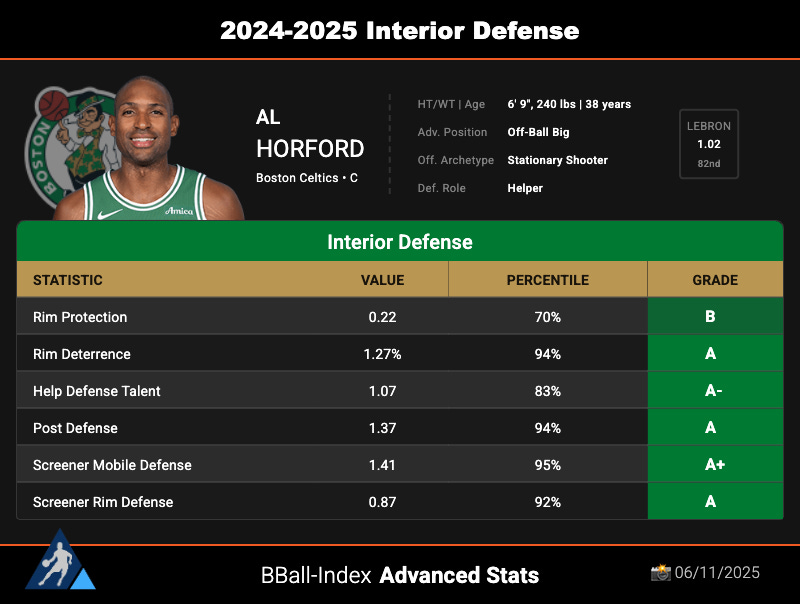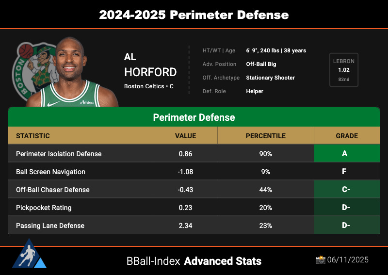 A quick look at his primary defensive metrics shows that even now, with his 40th birthday slowly coming on the horizon, Horford can still guard his yard across all three levels.