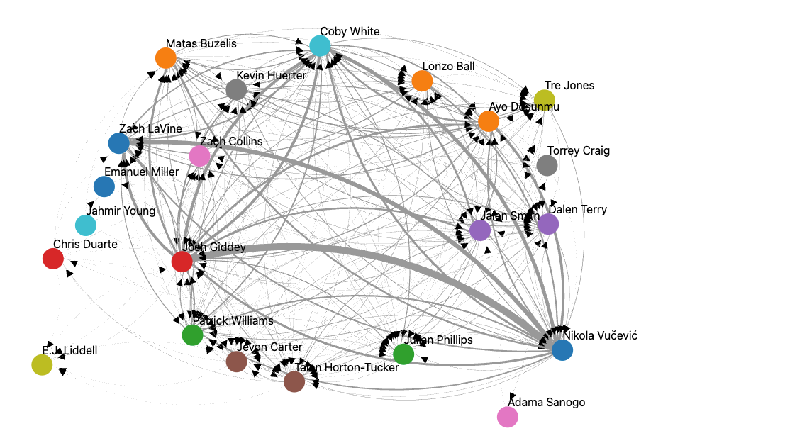 When looking at this image, the thicker the lines, the stronger the assist network is. So, Vucevic's best connection was with Giddey, with both finding each other consistently. There's a connection with Zach LaVine and Coby White, too.