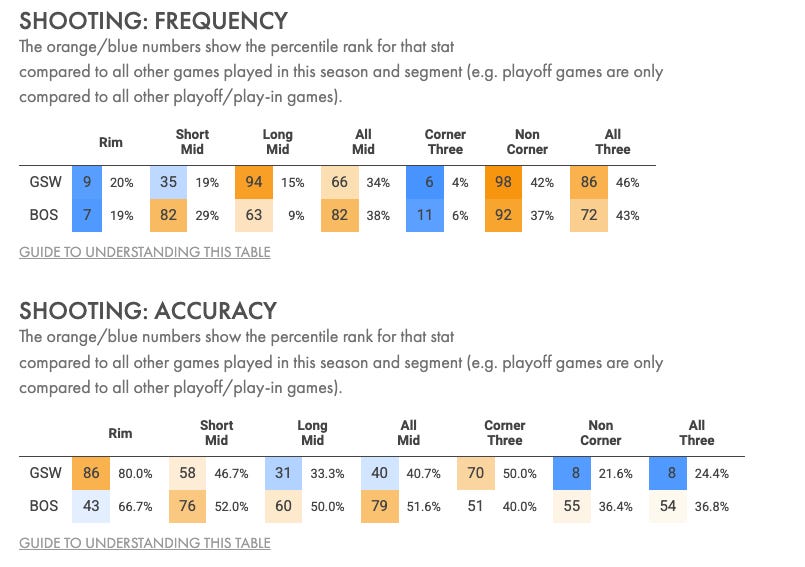 When you factor in the Warriors lack of elite shooting talent due to injury, and couple that with the Celtics defensive talent on the perimeter, it’s no surprise the Warriors shot just 24.4% from three in non-garbage-time minutes.