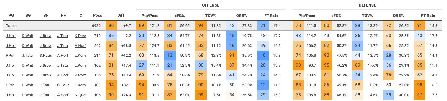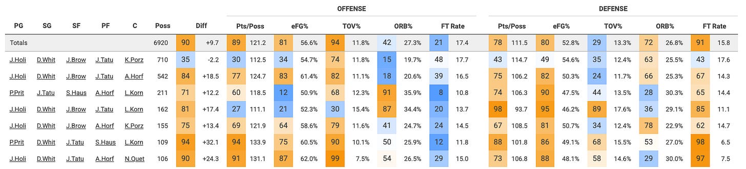 The five-man lineup of Jrue Holiday, Derrick White, Jaylen Brown, Jayson Tatum and Kristaps Porizngis is -2.2 points per 100 possessions. Their biggest issue is on offense (shockingly), with the team stagnating to 112.5 points scored per 100.