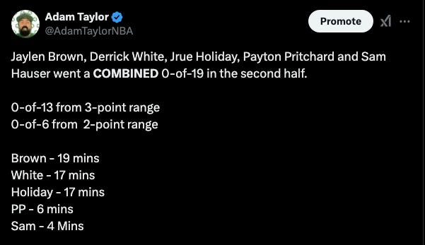 The Celtics shot 20% from the field in that second half. They went 8-of-40 and 2-of-24 from deep.