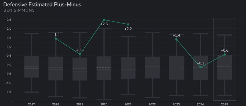 That number means Simmons was slightly above league average on defense last season. However, just two seasons earlier, he was among some of the better defenders in the NBA, with a +1.4 DEPM. To put this into context, Evan Mobley, the 2025 Defensive Player of the Year, had a +3.9 DEPM this season.