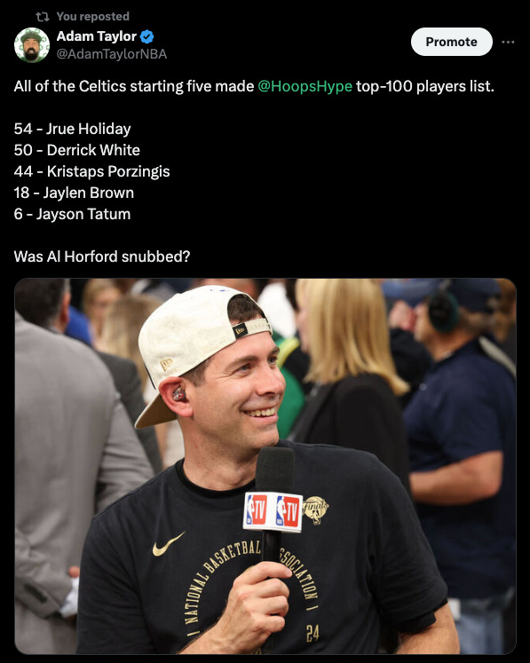 On September 10, HoopsHype released their top-100 player rankings. The Celtics had their entire starting five make the list. However, there was no room for Al Horford, who may or may not have been snubbed — I’ll let you decide.