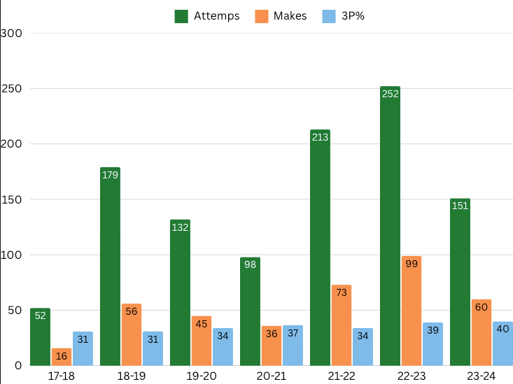 🗣️ My Take: I found the tidbit about Torrey Craig quite interesting, so I went back and looked at his shot profile in terms of frequency and accuracy over his career. Here’s how his three-point attempts look in graph form.