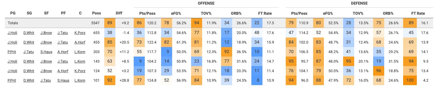 As you can see, the most impactful high-usage rotations are the one featuring Jrue Holiday, Derrick White, Jaylen Brown, Jayson Tatum and Al Horford — which is a +20.5 per 100 possessions over 655 possessions this season. And, the rotation of Payton Prtichard, White, Tatum, Sam Hauser and Luke Kornet, which is +28.8 per 100 over 101 possessions.