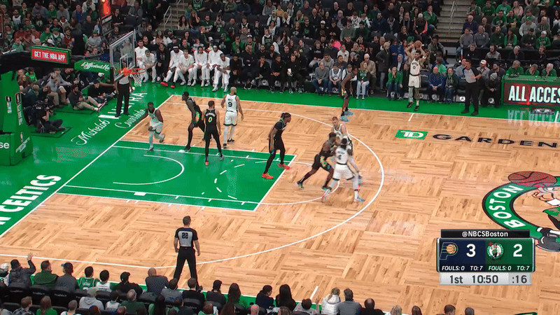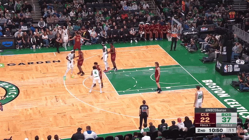 I call this action Split Corners. The play starts with the weakside corner guy cutting to the top of the perimeter before initiating a split cut with another shooter or ball-handler. The weakside guy relocates to his original spot on the floor, and the other player — Jaylen Brown in this instance — makes his own cut toward the strong side corner, where he receives the inbound pass.