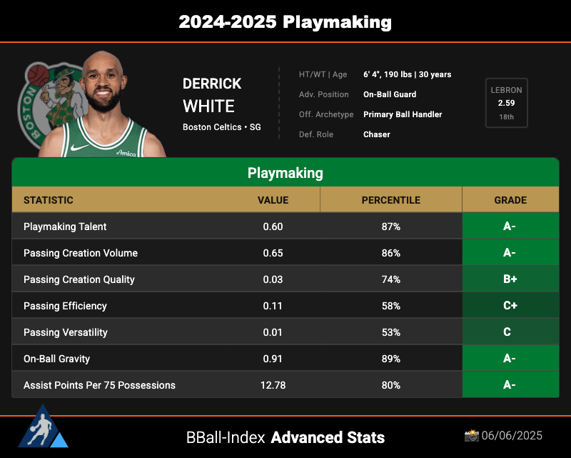 Outside of shooting, White was also a highly valuable playmaker, getting elite marks across a host of different metrics that measure the effectivness of a players’s on-ball creativity and shot-creation for others. Here’s a breakdown courtesy of the Basketball Index.