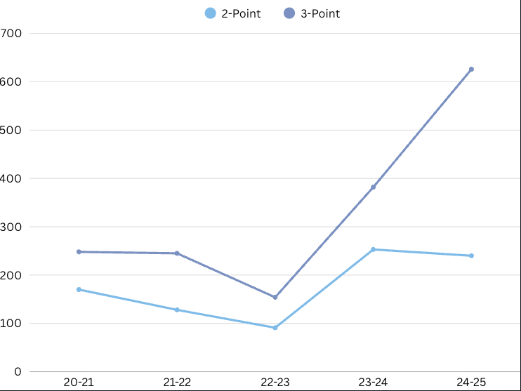 White’s overall three-point volume took a sharp upturn this season. He went from 490 attempts in 2023-24 to 681 attempts in 2024-25. Yet despite such a bigger shot diet, he continued to shoot consistently, dropping from 40% to 38% regardless of the increased volume.