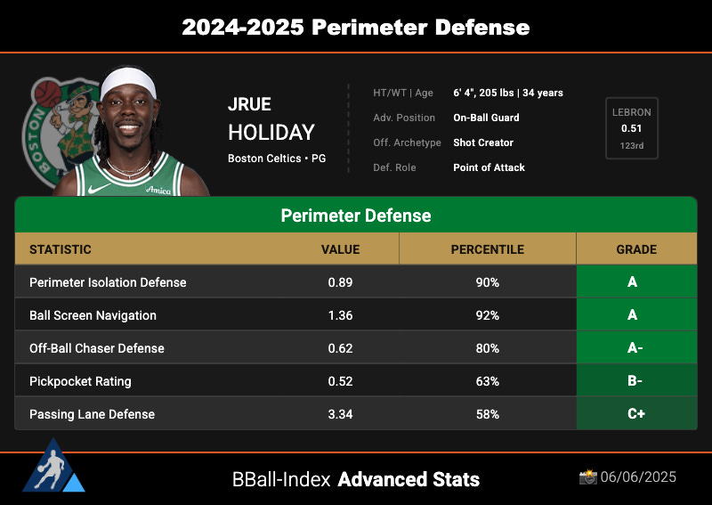 He also ranked among the best perimeter defenders in multiple key categories, including screen navigation and isolation defense — two of the most important parts of Boston’s point of attack system (as they are with every team, of course).