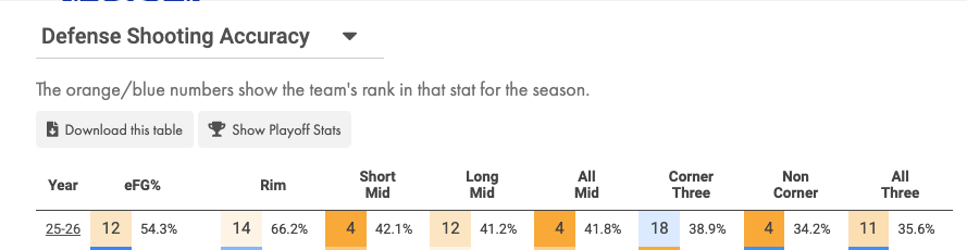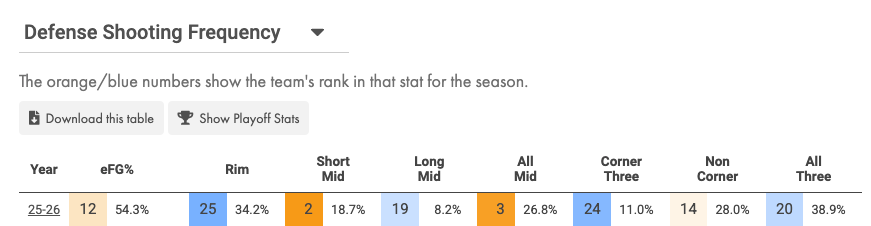 One thing Nurse’s team does well is bait teams into taking a high volume of threes per game. That’s why they rank 20th in the NBA for defensive three-point frequency. They’re fine with letting you get your shots up because they know they can impact them at a good-enough rate for it to be an effective strategy.