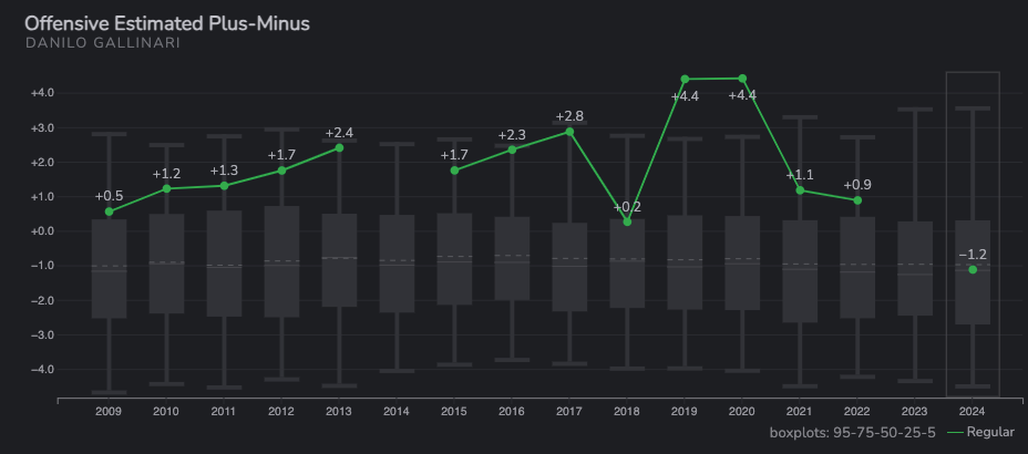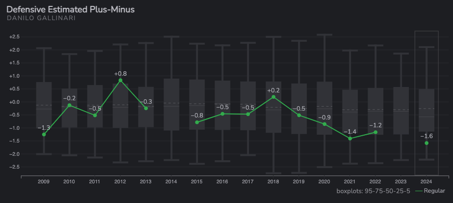 According to Dunks and Threes, which provides data on a player's estimated plus/minus, Gallinari is a career-low -1.6 in defensive EPM.