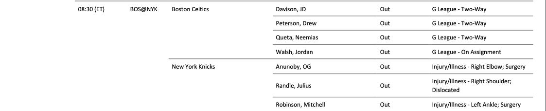 We won’t see that version of New York tonight. Anunoby is out. Julius Randle is out. Mitchell Robinson is out. Three critical guys within Tom Thibodeau’s rotation are all missing.