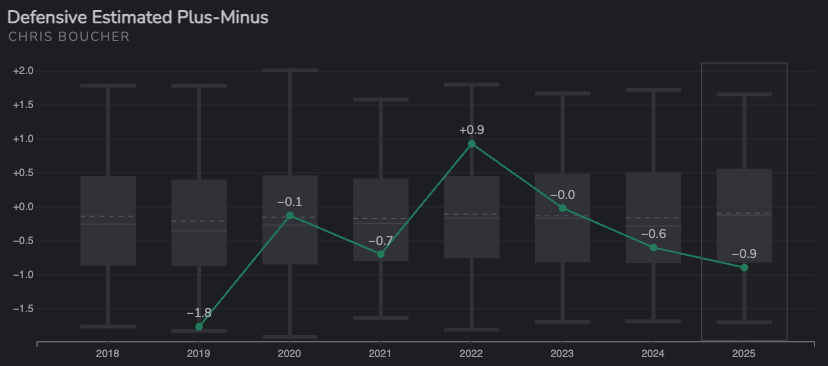 On defense, Boucher is right at the level of a bench player in terms of impact. Dunks And Threes tracked the 32-year-old as having a -0.9 Defensive Estimated Plus/Minus last season. I like DEPM as a stat because it adjusts for the players around you, and contextualizes how those players could positively or negatively impact performance.