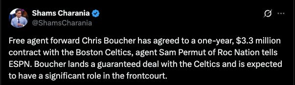 In terms of what the Celtics needed to boost the front court, Boucher checks multiple boxes. If he can show marginal improvement to his defense, he will be a net neutral on that side of the floor, thus making him an all-around positive addition to the rotation.