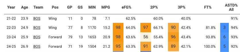 I don’t expect him to remain mired in the sub-35% category all season. However, I’m not sure if we see him crack the 40% conversion rate mark, either. Not unless Tatum returns and is firing off passes at an elite level.