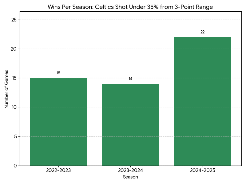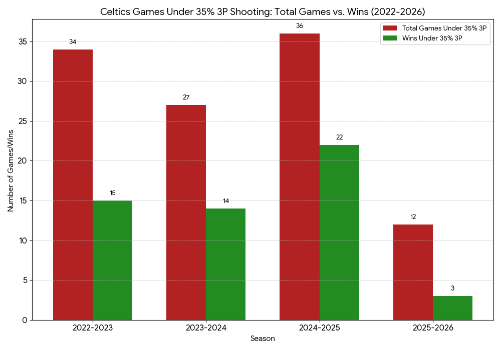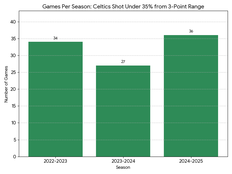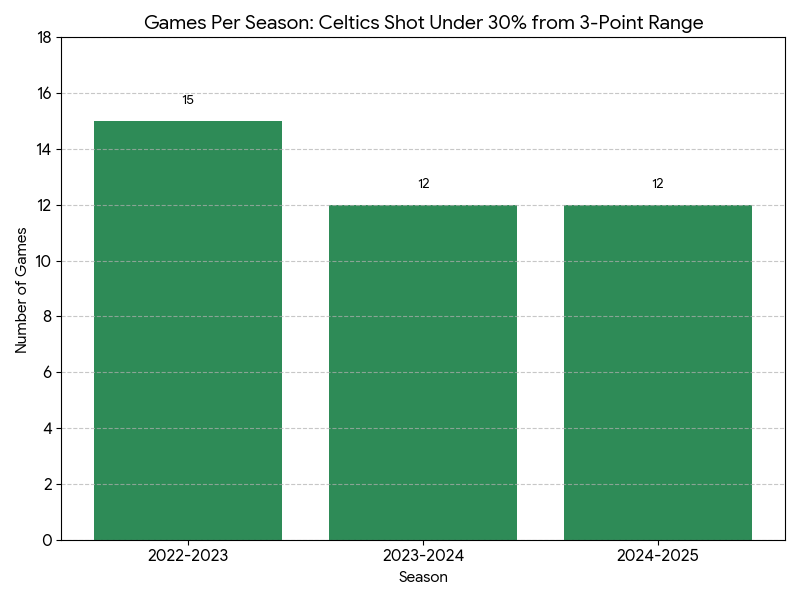 We’re just over a quarter of the way through the season, and the Celtics have had 12 games where they’ve shot under 35% from deep — a staggering 48% of their games so far. The median number of games under that three-point threshold over the past three seasons is 34.