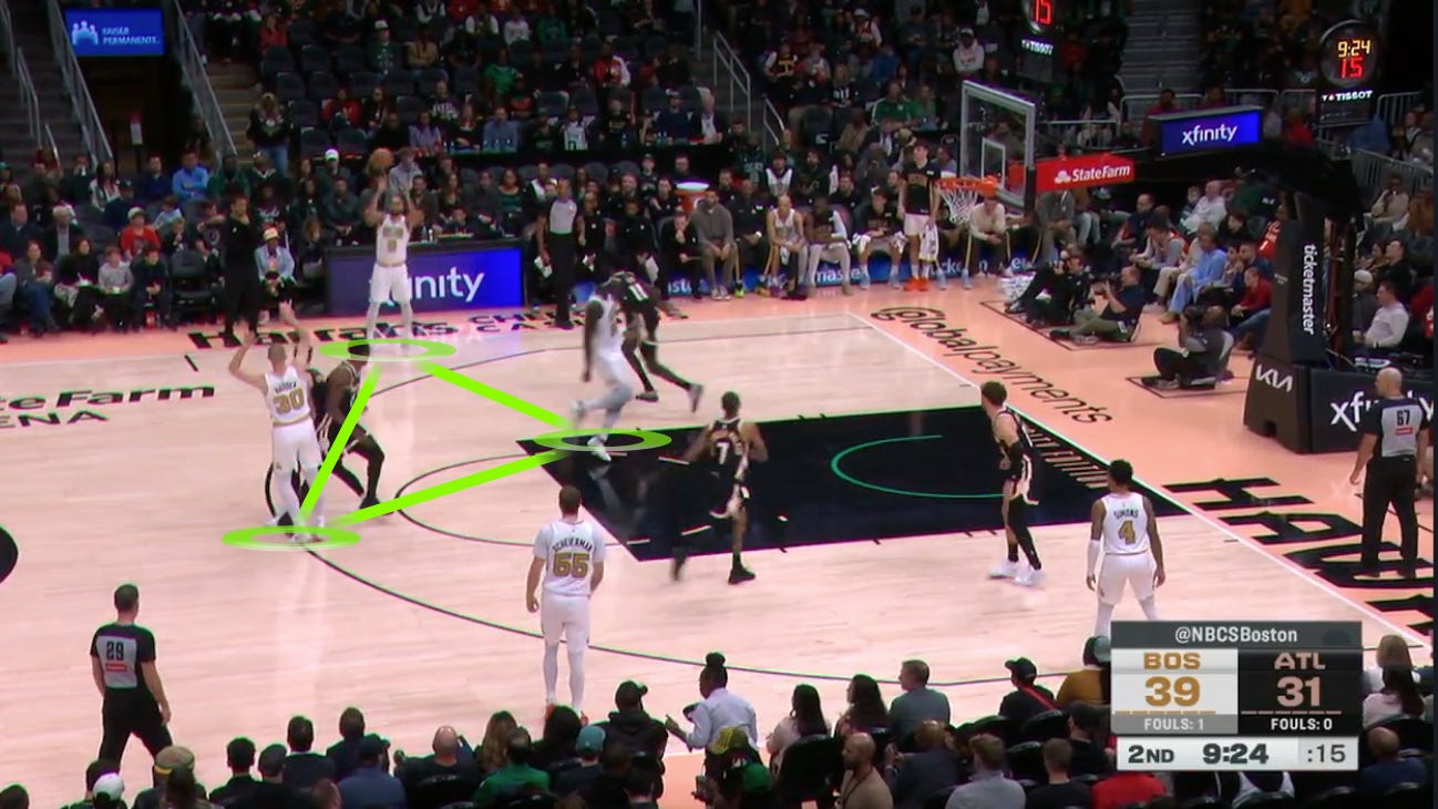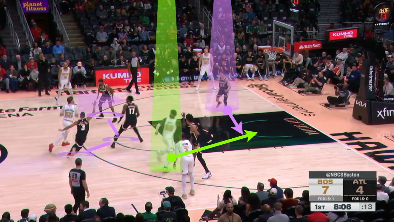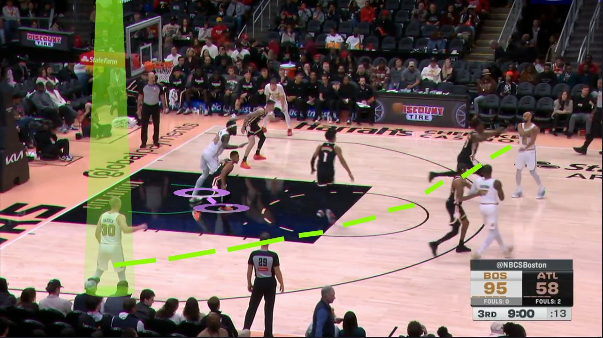 As such, Vit Krejci is forced to help off the weakside corner — where Sam Hauser is chilling — to pick up Queta’s roll, tag him, and remove the lob threat.