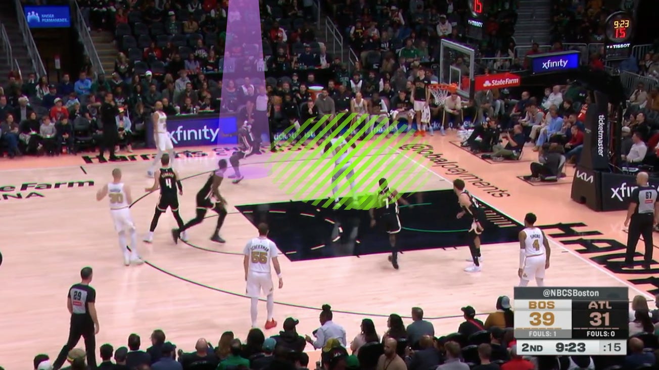 With the Hawks sending two to Sam Hauser after he comes off Queta’s screen, and Atlanta’s hands staying high to deny an entry pass to Queta, Hauser kicks to White, thus creating the angle for an entry pass.