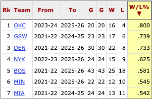The volume matters here, too. Boston's 43 games make it the most battle-tested number on this list. OKC’s .800 looks dominant, but it's built on 20 games. If they have a bad series or two, that number looks very different.