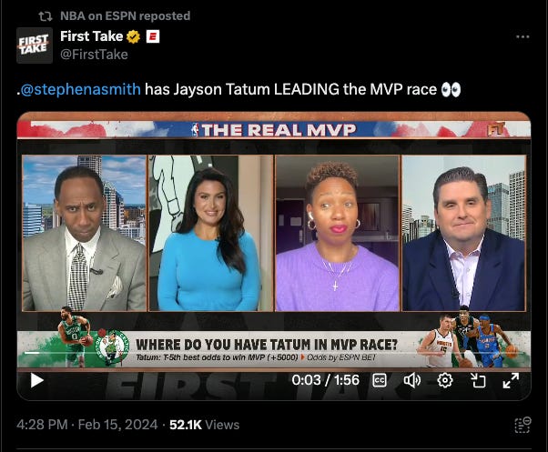 For Celtics fans, it feels like we universally accepted that Tatum’s chances of winning MVP this season were non-existent. It's not because he isn’t deserving or is having a bad season. Rather, he has sacrificed so that his teammates can thrive.