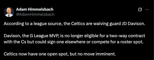 By waiving Davison, the Celtics have ducked back under the second luxury tax apron — if only until they sign a replacement. They’ve also opened up a roster spot in the process.