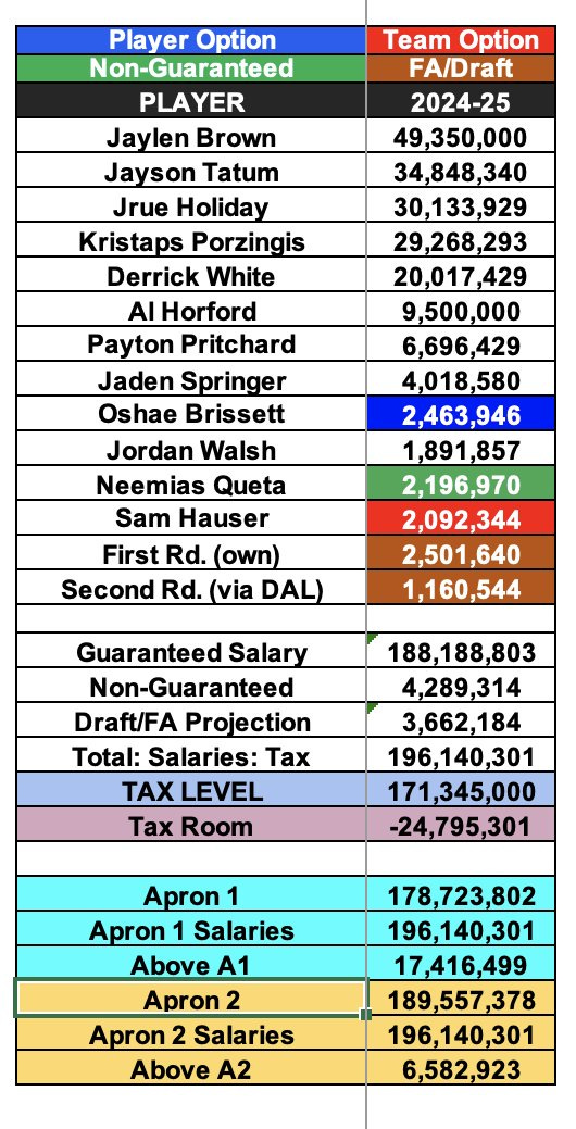 Keith: Ducking under the apron this season for Boston, even with Holiday at about $30 million, is nearly impossible. And that's actually a good thing for Celtics fans because it means the team won't be getting broken up. If we include Oshae Brissett and Sam Hauser (they have a player and team option, respectively), and the team's first-round pick, Boston projects to be at about $192 million.