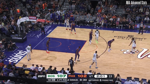 In the second clip, the Celtics run a “Chin action.” Essentially, it’s the same principle as a Horns Flare, but the screen receiver cuts on the non-ball side of the play. When Brown does this, he engages Jrue Holiday’s defender, forcing a stunt and opening up the nail. That allows Holiday to enter into the short roll and forces the Suns’ defense to send the weak-side low-man as a helper. Of course, that then opens up the kick-out to Al Horford, who is now open in the corner and ends in a three.