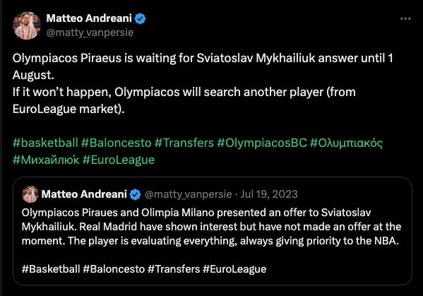 Before the 2023-24 season began, Svi Mykhailiuk received significant interest from some of Europe’s heavy hitters. Matteo Andreani of BasketInside.com reported that Olympiacos extended an offer to the sharpshooting wing. Olimpia Milano was also rumored to have made a contract offer. Real Madrid were rumored to have interest, too.
