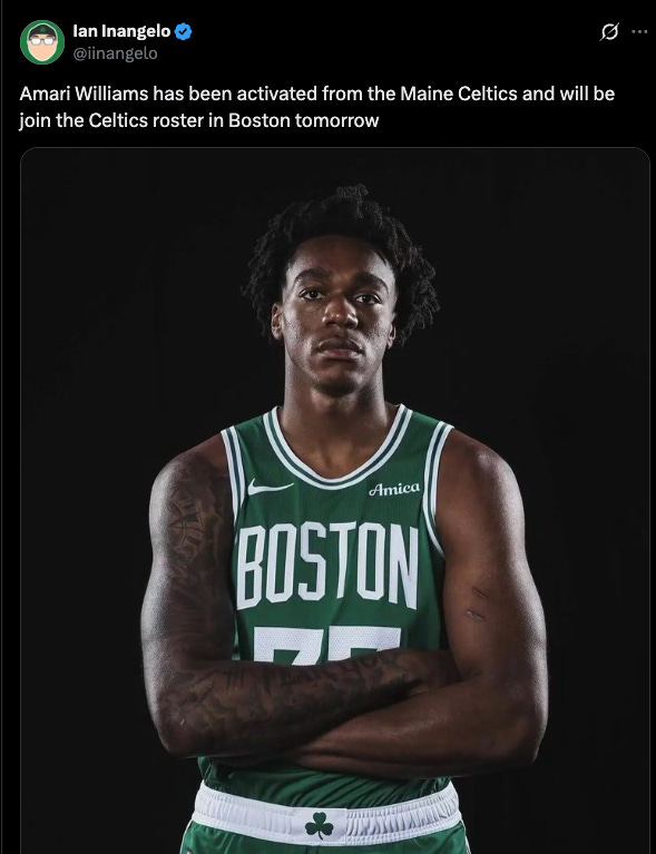The Celtics opted to call up rookie big man Amari Williams from the Maine Celtics yesterday afternoon.
