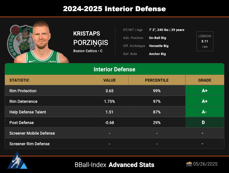 Here’s how Porzingis grades out for interior defense, per Basketball Index.