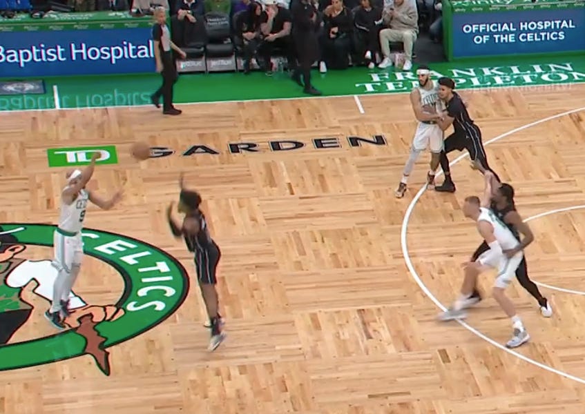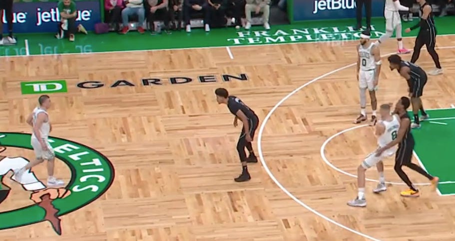 From there, the Celtics flowed into a pick-and-pop with Tatum as the popper. Porzingis faked a flare screen for Tatum and then slipped the screen to get open in the lane. Bucket.