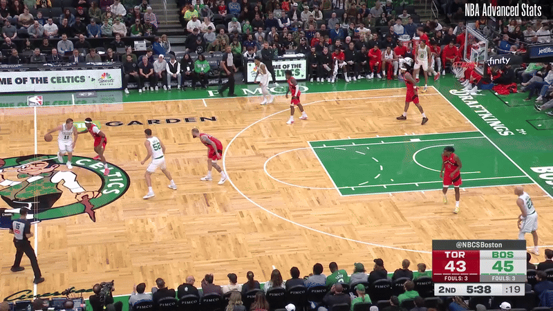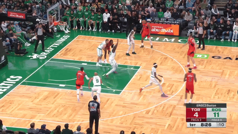 The Celtics contested 69 of the Raptors’ shots, opposed to the 45 shot contests they faced on their own looks. Joe Mazzulla has his team pinching on penetrating, killing driving lanes with gap help and then rotating out into quick recoveries when/if the ball finds its way back outside.
